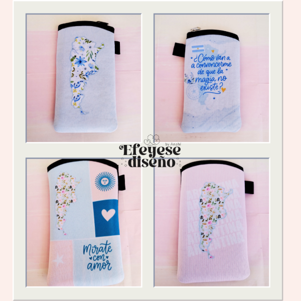 Funda para celular en tela símil neoprene, de 19x10 cm aproximadamente, frente color, trasero negro, cuenta con abrojo superior para el cerramiento