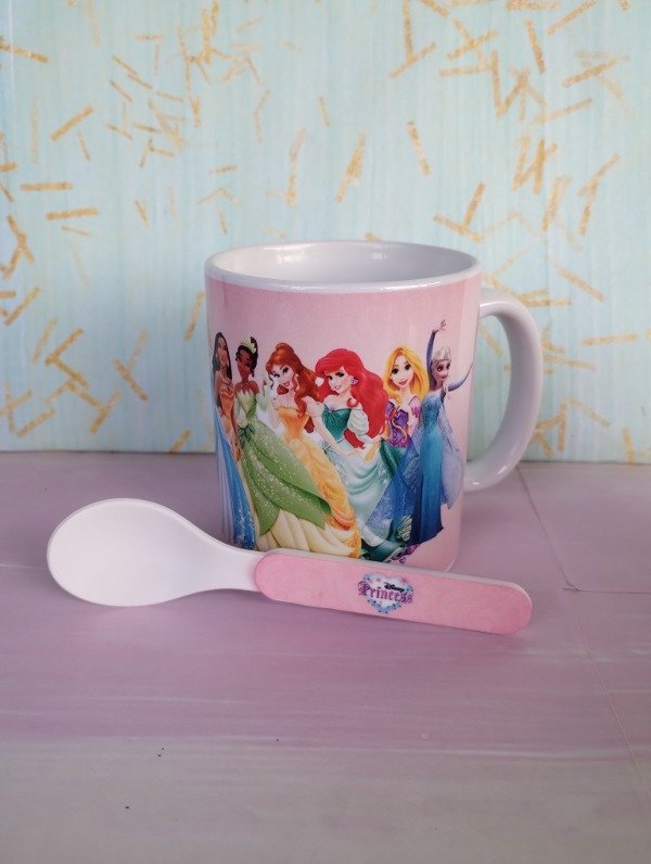 Taza de cerámica importada, apta microondas, excelente terminación y colores con cuchara de polímero. Capacidad 350 cc, 9 cm de alto x 8 de diámetro aproximadamente.